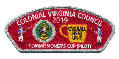 2019 Commissioners Cup Pilot. Revolutionary War soldiers flank Scout emblem surrounded by silver wreath and gold cup with "Overall Best Unit" lettering