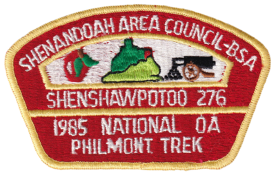 Light yellow boarder, light yellow inside boarder, 1985 National OA "Philmont" Trek correctly spelled, Shenshawpotoo 276 listed as X6b