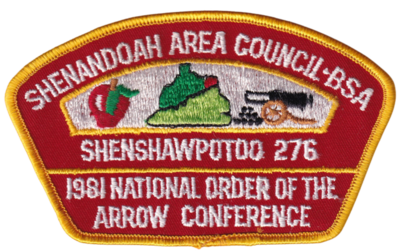 Tall CSP, dark yellow border, 1981 NOAC National Order of the Arrow Conference, Shenshawpotoo 276 contingent. Listed as X3 in Shenshawpotoo section.